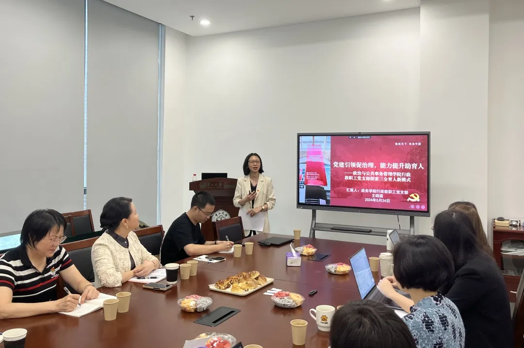 座谈会上,政治与公共事务管理学院行政教职工党支部书记王晓茵老师做“党建引领促治理,能力提升助育人”的报告。王老师带领所在党支部打造了“抓党建、促治理、聚人心、共育人”工作品牌,并从四个维度分享党支部建设经验。一是提升思想站位,深化工作目标,推动党建与业务深度融合;二是打造学习型支部,提高履职能力,提升治理水平;三是适应数智化时代的管理,加强技术支撑;四是凝聚和协同多元主体力量,建优建强党支部,使之成为落实立德树人根本任务的坚强堡垒。王老师还分享了许多具体实践工作案例,具有很强的针对性和实操性,让参会者一看就懂、一学就会、一用就有效果,深受好评。