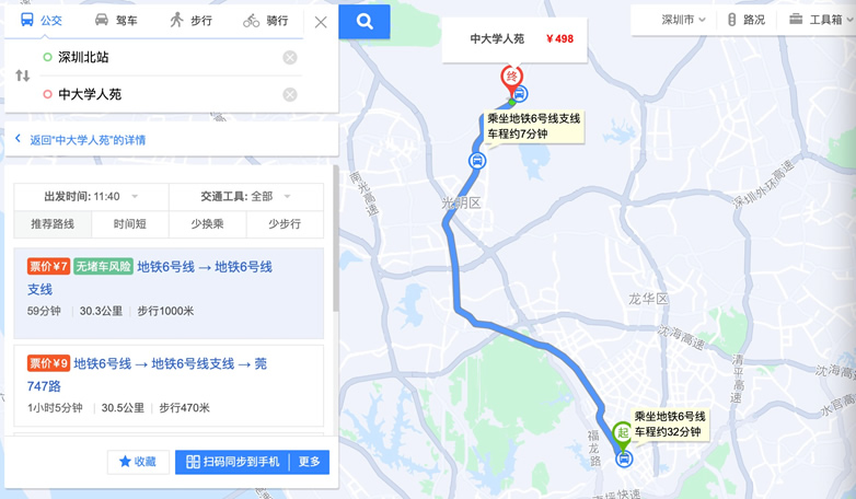 方案2:地铁:深圳北站乘坐6号线(松岗方向)转6号线支线公交,约1.5小时:经深圳北站“深圳北 地铁站”A口上车,搭乘地铁6号线,乘坐10站到达“光明 地铁站”;站内换乘地铁6号线支线,乘坐3站到达“深理工 地铁站”,从C1口出站,步行860米到达中大学人苑。