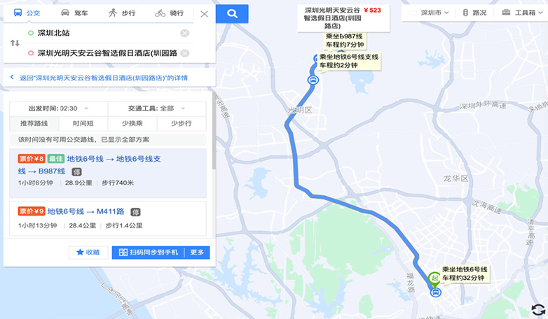 方案2:地铁:深圳北站乘坐6号线(松岗方向)转6号线支线转B987公交,约1.5小时:经深圳北站“深圳北 地铁站”A口上车,搭乘地铁6号线,乘坐10站到达“光明 地铁站”;站内换乘地铁6号线支线,乘坐1站到达“圳美 地铁站”,从A1口出站,步行240米,从”圳美地铁站 公交站“搭乘B987路公交车,乘坐4站到达”光明云谷 公交站“下车,步行360米到达深圳光明天安云谷智选假日酒店。