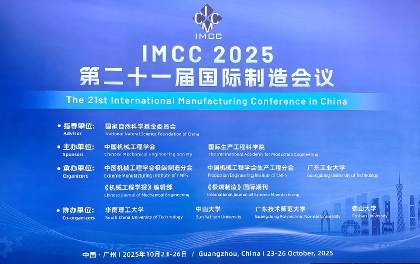2025年10月23日至26日,第二十一届国际制造会议(IMCC 2025)在广州白云国际会议中心成功召开。本次会议由国家自然科学基金委员会指导,中国机械工程学会极端制造分会、中国机械工程学会生产工程分会、广东工业大学、《机械工程学报》编辑部及《极端制造》编辑部联合承办。IMCC 2025吸引了来自全球各地的1600余名专家学者参会,中山大学先进制造学院作为大会协办单位,全程参与此次大会,充分展示了我院在先进制造领域的学术活力与国际影响力,有效提升了学院在国内外的学术声誉。
