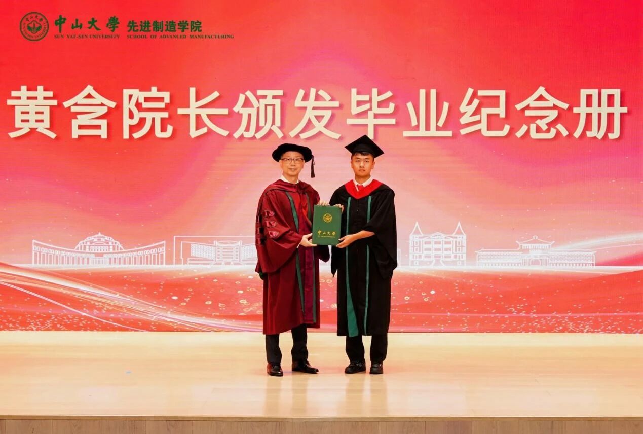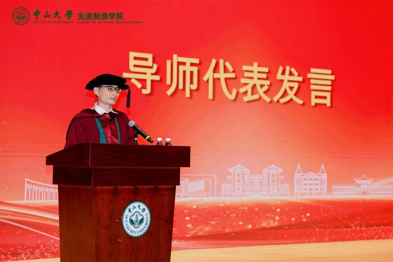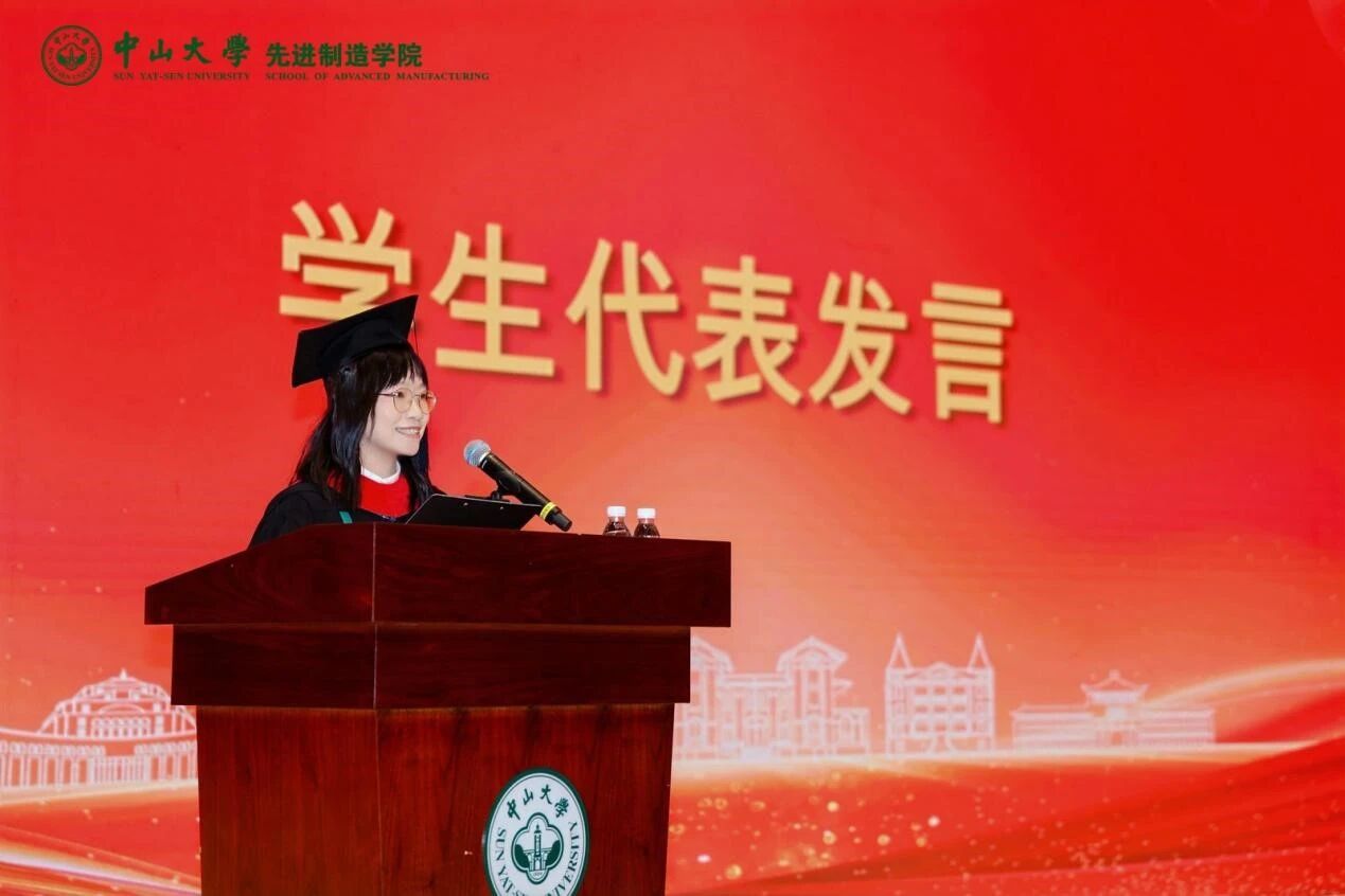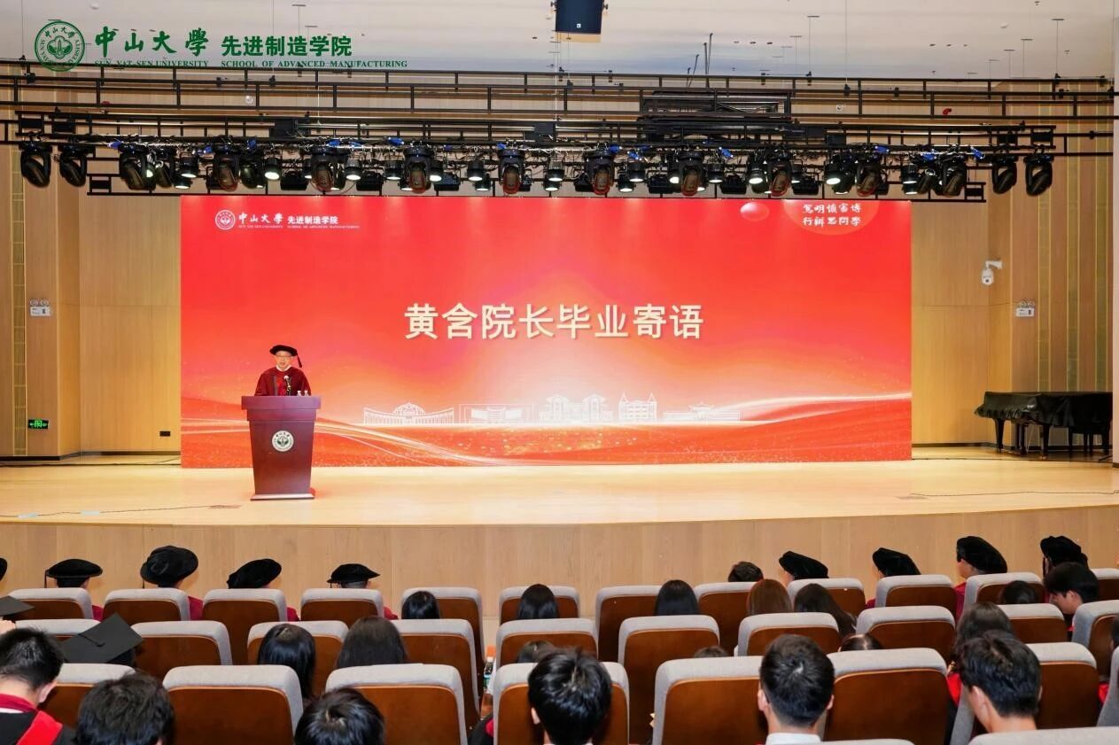 黄含院长向全体毕业生作毕业寄语,代表学院向圆满完成学业的同学们表示热烈祝贺,言辞如诗,意境深远。2025届毕业生,是中山大学先进制造学院的首届学生,是学习的先行者,更是学院制度与文化的建设者。黄院长以“修身、立命、勤学、索新”为核心,从学习、生活、工作等方面向毕业生们致以诚挚的祝福和期望。他立足科技前沿与国家战略需求,描绘了先进制造的广阔天地。希望同学们能够保持好奇心,不断探索新知,将所学化作推动社会进步的强大引擎,在未来的实践中劈波斩浪,绘制宏伟的人生蓝图。