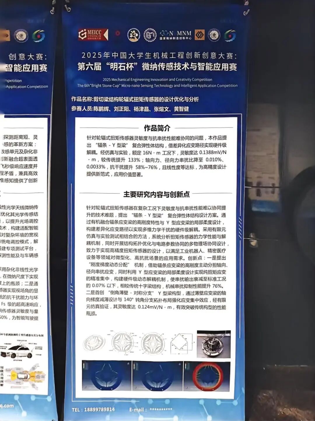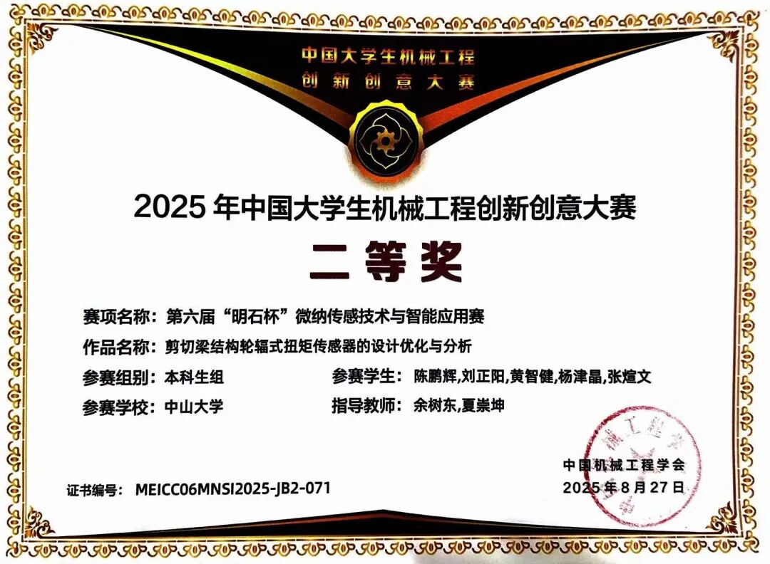 在2025年度“明石杯”全国大学生传感器应用设计大赛中,由我院2023级与2022级本科生陈鹏辉、刘正阳、张煊文、杨津晶、黄智健组成的参赛团队,在先进制造学院余树东老师、夏崇坤老师的指导下,凭借创新项目《剪切梁结构轮辐式扭矩传感器的设计优化与分析》,从全国327所高校的2100余支参赛队伍中脱颖而出,荣获全国二等奖。此成绩标志着我院新一代本科生在国家级科技创新竞赛中取得的重要突破。