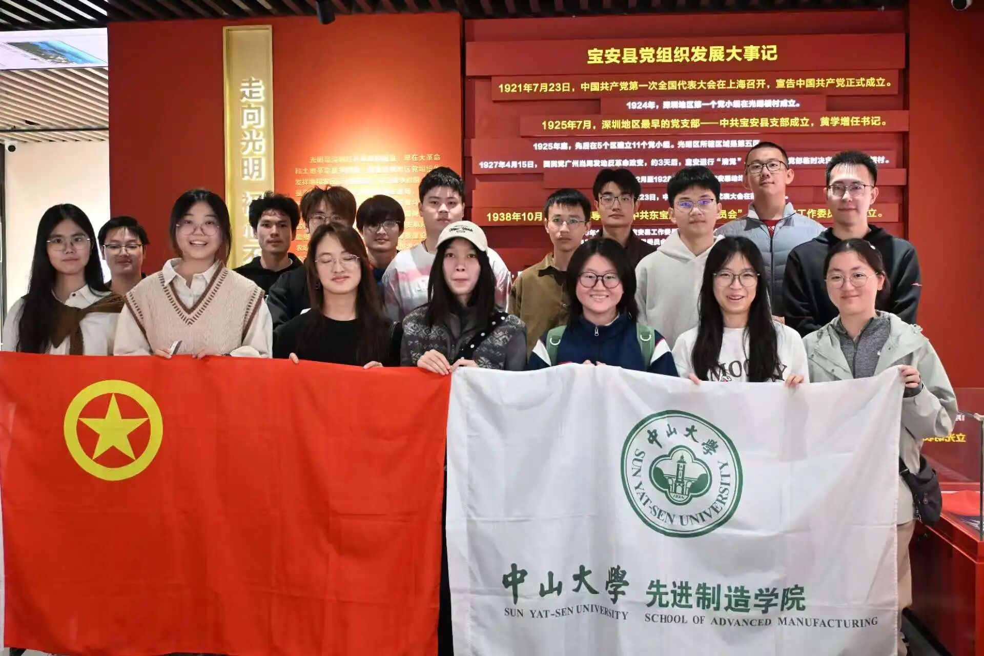在党组织发展大事记前,同学们集体合影,定格下青春与历史交汇的珍贵瞬间。