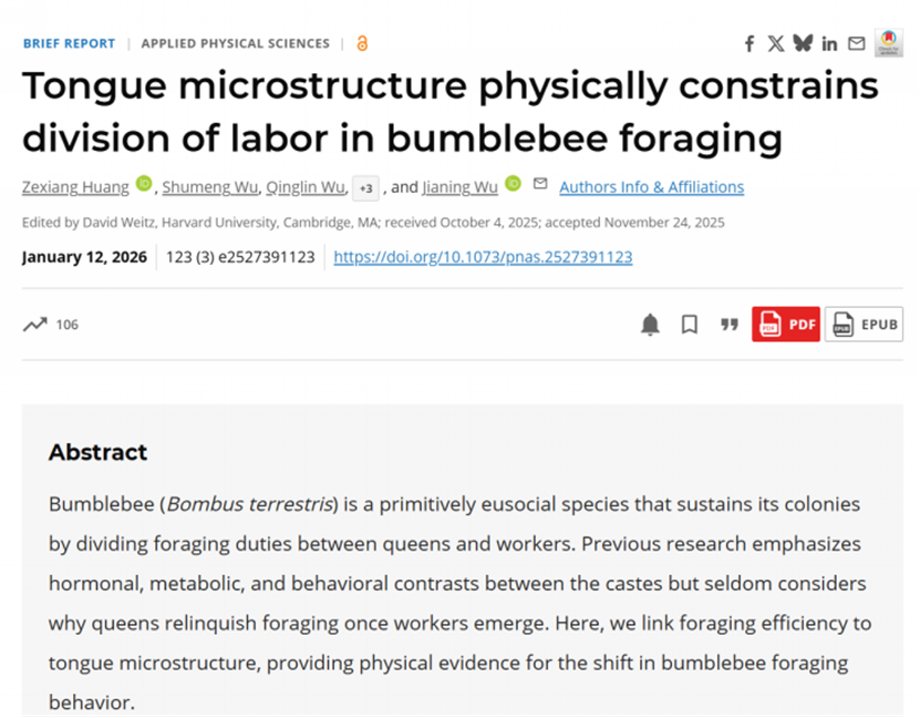 近日,中山大学先进制造学院吴嘉宁教授作为第一通讯作者,指导2023级硕士研究生黄泽翔、2023级本科生伍书萌、麦天宇等学子,在熊蜂级型分化与舌部微结构的功能关联研究中取得原创性发现。研究成果以“Tongue microstructure physically constrains division of labor in bumblebee foraging”为题,发表于国际顶级综合性学术期刊《Proceedings of the National Academy of Sciences of the United States of America (PNAS)》(中科院1区),这一成果彰显了学院在学科交叉创新领域的硬实力。